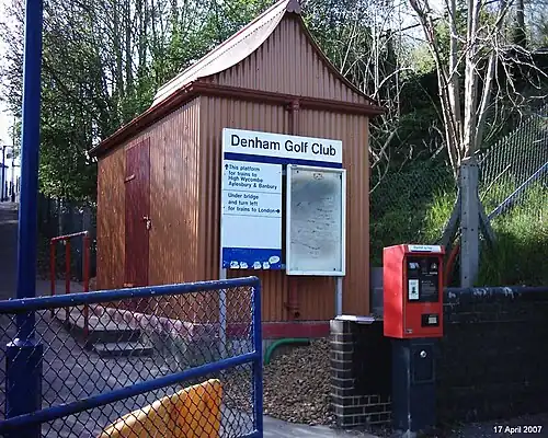 The station was opened on 22 July 1912,[1] at the request of the Golf Club, which had opened the previous year.[2] It is on what was the Great Western and Great Central Joint Railway, which had been opened in 1906. The station was originally called Denham Golf Club Platform, and it was built to serve the adjacent golf club. Between the two World Wars the platforms were lengthened and the station was made a halt. The original "up" platform was on the London side of the road bridge, and made of wood, with an access path connecting to the track leading to the Golf Club. In 1954[3] British Railways had a new concrete "up" platform built on the Wycombe side of the road bridge, opposite the "down" platform, which was also rebuilt in concrete. At the same time a proposed name change to 'Higher Denham' was rejected.[2]