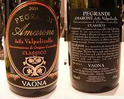 Labels of the Italian wine Amarone della Valpolicella Classico 2004 from the Pegrandi vineyard produced by Vaona. The label indicates that this is a DOC class wine from the Classico region of Valpolicella.