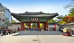 Daehanmun (대한문; 大漢門; Taehanmun) is the current main gate of the palace and is located on the east side of the complex. It was originally called Daeanmun (대안문; 大安門; Taeanmun). It was completed in 1898.[61] The original main gate was Inhwamun, but that gate declined in use and status compared to Daeanmun. In 1900, Daeanmun was made the official main gate.[62] The gate was destroyed in the 1904 fire and rebuilt in 1906.[2] On April 25, 1906, it was renamed to Daehanmun and made the main gate.[63] Its new name board was written by Nam Chŏngch'ŏl. The gate was moved inwards towards the palace in 1914 during a road expansion project. It was moved again in 1970 to its final location. It is decorated with dancheong decorative coloring and statues of various beasts.[64]