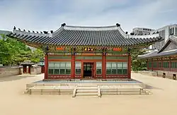 Junmyeongdang (준명당; 浚眀堂; Chunmyŏngdang; 'to govern clearly and brightly') is a building that was used to receive foreign envoys. It was originally completed in 1897 but was destroyed in the 1904 fire. It was then rebuilt.[83][84] In 1916, the building was used as a kindergarten for the last Korean princess Deokhye.[84] The building is now in an L shape. It is equipped with an ondol underfloor heating system.[83]