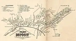 The position of the village is at the boundary of White and Indian territory, as imposed by the 1763 Fort Stanwix Treaty. The village was incorporated in 1811 in Delaware County. Deposit is one of only twelve villages in New York still incorporated under a charter, the other villages having incorporated or re-incorporated under the provisions of Village Law.[3]