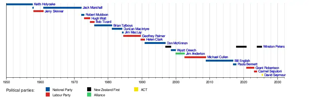 The role existed on an informal basis for as long as the office of prime minister/premier has existed, but the office of "deputy prime minister" was formally established as a ministerial portfolio in 1949.[2] This means that Keith Holyoake is considered the first deputy prime minister. It was formally designated as a full cabinet level position in 1954.[3]