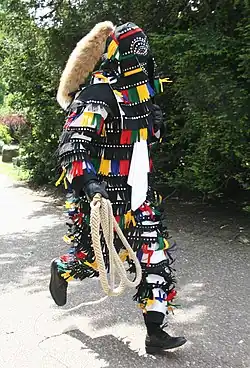 The character Hänsele appears on the Saturday and Sunday before Ash Wednesday.[2] It also appears in July in connection with the Überlinger Schwerttanzkompanie (Sword dance company of Überlingen) at the second Schwedenprozession (a procession to commemorate the successful defense of the Swedish siege in the Thirty years War) on the second Sunday in July. During the sword dance only one person at a time plays Hänsele, and he is involved in all civic celebrations; his identity usually remains anonymous. Hänsele's costume is noted for its colorful felted squares, its fox tail, and the women's perfume worn on the mask. In addition, Hänsele carries a heavy whip; prior to Fasnet, groups of uncostumed Hänseles gather in the market square to practice snapping their whips.