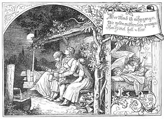 "Der Mond ist aufgegangen" (German for "The moon has risen") is a German lullaby and evening song by Matthias Claudius, one of the most popular in German literature. Also known under the name Abendlied (German for "evening song") it was first released in Musen-Almanach in 1779, published by Johann Heinrich Voß.[1] In 1783, Claudius published the poem with a modification to verse six in Asmus omnia sua secum portans oder Sämmtliche Werke des Wandsbecker Bothen IV. Theil.[2]
