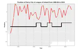 Since 1989, Derry has won the League of Ireland Premier Division once – in 1996–97 – but has been runner-up on three occasions. It added five more FAI Cups to its tally in 1995, 2002, 2006, 2012, and 2022, and was runner-up in 1994, 1997, 2008, and 2014 and has also won ten further League Cups.[26]