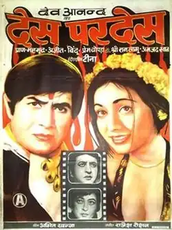 Des Pardes (transl. Home and Abroad) is a 1978 Hindi drama film, produced and directed by Dev Anand. It stars Dev Anand and Tina Munim (in her debut film), with Ajit Khan, Pran, Amjad Khan, Shreeram Lagoo, Tom Alter, Bindu, Prem Chopra, A. K. Hangal, Sujit Kumar, Mehmood and Paintal in the supporting cast. For the first time, Dev Anand chose comparatively new music director Rajesh Roshan for this film, who did full justice to his selection as most of the songs became quite popular. The film received a Filmfare award for its sets and also received a nomination for best music director. The message of this film is about the trend with some people, at the time, to earn money from foreign lands and that innocent ones being trapped and tormented by the illicit operators.[1]