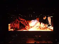 Shakira included "Despedida" on the setlist of her The Sun Comes Out World Tour (2010–11), where she performed it as a medley with "Nothing Else Matters" (1992), by American band Metallica.[19] For the performance she was dressed with a crop top and a red skirt.[20] Jon Pareles from The New York Times praised her performance in New York, saying that "she used her body, with a girlish grin and dance moves of finely calibrated sensuality: angular hip twitches and smooth slow-motion swivels, chest thrusts and sinuous wrist turns, as if her every joint rotates 360 degrees".[21] A writer of Sprinning Platters praised the performance of the song, calling it a "seductive dance number in which she managed to test the skill and professionalism of her drummer by incorporating him into her moves", further dubbing it a "'you had to be here' moment".[19] The live performance of "Despedida" was included on her album Live from Paris (2011) which was filmed during the concerts held on June 13 and 14 at the Palais Omnisports de Paris-Bercy.[22] It was also made available for purchase on the iTunes Store and released to the singer's official Vevo account on January 11, 2012.[23][24]