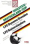 A similar match was held on 22 August 1990 to celebrate German reunification. The match featured the reigning cup winners of East and West Germany, Dynamo Dresden and 1. FC Kaiserslautern, respectively. The match, which was played at the Rudolf-Harbig-Stadion in Dresden, was won 2–4 on penalties by Kaiserslautern, following a 1–1 draw after extra time.[3]
