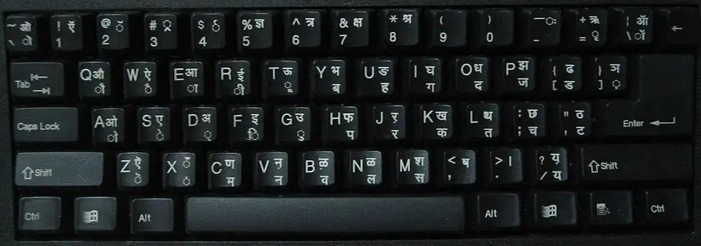 ![]() Devanāgarī script (vowels top three rows, consonants below) | |