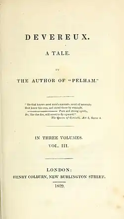 Devereux is an 1829 historical novel by the British writer Edward Bulwer-Lytton, published in three volumes. He earned £1,500 for the novel from his publisher Henry Colburn, trebling his earnings from the successful silver fork novel Pelham of the previous year.[1] He dedicated it to his friend the Canadian traveller and writer John Auldjo, then living in Naples. [2]