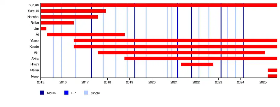 Their first major album, Blue Youth, was released on February 4, 2024.[28] On October 23, they released the compilation album, Devil Anthem. 10th Anniversary Collection/The Best Miraculous Trajectory.[29] They went on hiatus after their final concert on December 27.[30] Airi graduated from the group in February 2025.[31] On March 23, the group resumed activities with the addition of Meisa Shiozaki and Nene Yabuki as new members.[32]