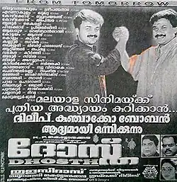 Dhosth (transl. Friend) is a 2001 Indian Malayalam-language action thriller film directed by Thulasidas. Kunchacko Boban and Dileep share the title roles along with Kavya Madhavan, Jagathy Sreekumar, Kalabhavan Mani and Shiju in supporting roles. It is a remake of the Tamil film Kannedhirey Thondrinal (1998).[1][2][3][4] The film was a box office success.[5]