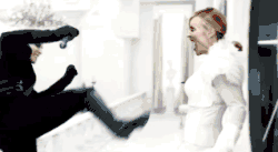 It opens with Madonna being dragged by soldiers into a torture chamber, battered and marked with three Hebrew letters —Lamed, Aleph and Vav— on her forearm.[9][67] After being violently thrown around and submerged in icy water, she breaks into a defiant, provocative dance amid chains and broken glass.[9] Intercut throughout is a fencing duel between two Madonnas —one in black, one in white— inside a sterile glass-lit room. Their inflicted wounds mirror those of the tortured Madonna. The sequence features nods to past Bond films, including a portrait of Pierce Brosnan and a character with "deadly bowler hats", portrayed by the nephew of actor Harold Sakata, who starred in Goldfinger (1964) as Oddjob.[4][9]