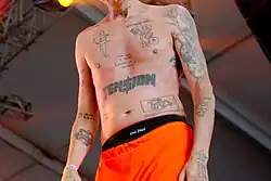 Vogue's Liana Satenstein likened Ninja's fashion style to that of a "weird dad", describing it as "laze-about, slightly sleazy, and sand-strewn".[202] Visser is also known for her haircut, a bleach blond mullet with short bangs, which she has said inspired Die Antwoord's overall visual direction after Ninja first cut it for her in 2009.[203][204][12] Ninja is known for his tattoos, which are inspired by prison tattoos and Cape Flats gang tattoos and are mostly stick and pokes done by South African tattoo artist Tyler B. Murphy.[205][206][207] Ninja stated in 2010 that their artistic style is inspired by "the art of children, and the criminally insane" because of a lack of "that hard barrier between their conscious and subconscious minds".[208]