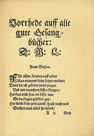 The reformer Martin Luther wrote the text as part of a longer poem of praise, not intended to be sung.[1] The topic is firstly praise of music, especially singing, which turns to praise of God.[1] The long poem appeared as a preface of a 1538 publication by Johann Walter, Lob vnd preis der loblichen Kunst Musica, praising the art of music. Luther's preface was titled Vorrede auf alle guten Gesangbücher (Foreword on all good hymnals), subtitled Lob der Frau Musica (The praise of Lady Music), with Music speaking. Luther's poem appears also in Joseph Klug's Wittenberger Gesangbuch of 1543.[1]