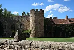 Diego López de Medrano chose to build a solid square house with a coat of arms, a central courtyard, defended with a barrier, part of which still exists, along with battlements on its walls, and round towers on three of its corners that still retain the stone-carved gargoyles and the artillery tubes from the 15th century.[28][23] The castle of San Gregorio was designed in the medieval Gothic-style, attached to a Renaissance church and cloister.[23] The San Gregorio estate covers an area of more than 1,500 m2. It is a medieval architectural complex.[30]