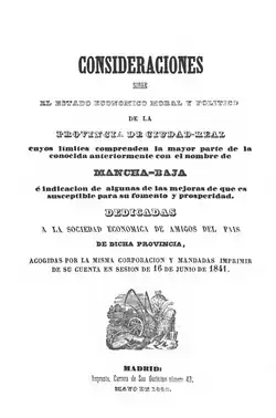 In his "Considerations on the economic, moral, and political state of the province of Ciudad Real" (1843), Diego de Medrano expressed his gratitude to the Economic Societies of Friends of the Country, a group with whom he has been associated since its inception in 1834.[12]
