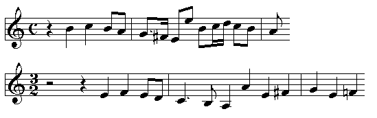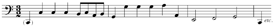 The number of fugues in a prelude varies from one to three, not counting the pseudo-fugal free sections. The fugues normally employ four voices with extensive use of pedal. Most subjects are of medium length (see Example 2), frequently with some degree of repercussion (note repeating, particularly in BuxWV 148 and BuxWV 153), wide leaps or simplistic runs of 16th notes. One of the notable exceptions is a fugue in BuxWV 145, which features a six-bar subject. The answers are usually tonal, on scale degrees 1 and 5, and there is little real modulation. Stretto and parallel entries may be employed, with particular emphasis on the latter. Short and simple countersubjects appear, and may change their form slightly during the course of the fugue. In terms of structure, Buxtehude's fugues are a series of expositions, with non-thematic material appearing quite rarely, if ever. There is some variation, however, in the way they are constructed: in the first and last fugues of BuxWV 136 the second voice does not state the subject as it enters during the initial exposition; in BuxWV 153 the second exposition uses the subject in its inverted form, etc. Fugue subjects of a particular prelude may be related as in Froberger's and Frescobaldi's ricercars and canzonas (BuxWV 150, 152, etc.):