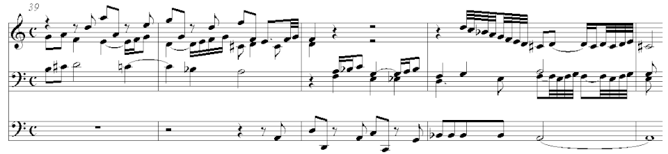 The fugal procedure dissolves at the end of the fugue when it is followed by a free section, as seen in Example 4: