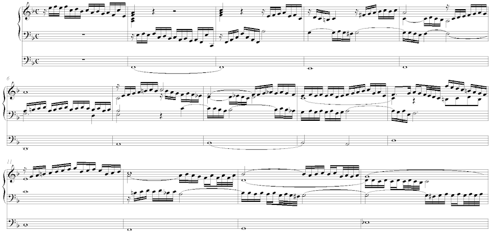 The introductory sections are always improvisatory. The preludes begin almost invariably with a single motif in one of the voices which is then treated imitatively for a bar or two. After this the introduction will most commonly elaborate on this motif or a part of it, or on a short melodic germ which is passed from voice to voice in three- or four-voice polyphonic writing, as seen in Example 1: