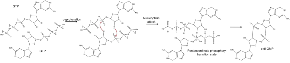 Though the exact catalytic mechanism has not been resolved, it is hypothesized that the dimerized structure of PleD facilitates interaction of the two GTP molecules within the DGC active site for cyclization. A proposed mechanism by Chan et al. indicates that the 3'-OH group of the GTP is deprotonated by a glutamic acid residue (E370) to allow for intermolecular nucleophilic attack of the α-phosphate. The pentacoordinated transition state created through this nucleophilic attack is possibly stabilized by a Lysine residue (K332).