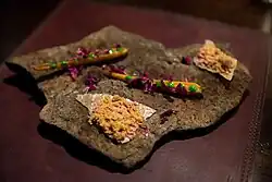 Gunnar Karl was one of the first proponents of New Nordic cuisine in Iceland;[1] he gathered herbs and vegetables both in a kitchen garden and in a greenhouse, and although the restaurant is not vegetarian, focussed his dishes on them rather than on meat or fish, which he did not always include.[2] He sourced barley from Eymundur Magnússon, a farmer who runs a company called Módir Jörð (Mother Earth) with his wife, and blue mussels from Simon Sturluson, a fisherman in Stykkishólmur who credits him with creating the restaurant market for them.[1] The restaurant also makes extensive use of smoked and dried ingredients.[3] In 2016 a restaurant review highlighted the dried puffin and trout smoked in the traditional Icelandic manner over straw impregnated with sheep excreta.[4]