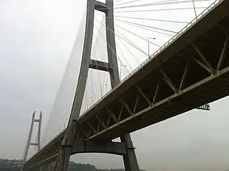 The Dingshan Bridge is a cable-stayed bridge which crosses the Yangtze River in Chongqing, China. Completed in 2013, it has a main span of 464 metres (1,522 ft). The bridge carries 6 lanes of road traffic of China National Highway 212 on the upper deck and Line 5, Chongqing Rail Transit between the Jiangjin District south of the Yangtze River and the Jiulongpo District to the north.[1]