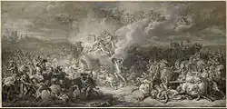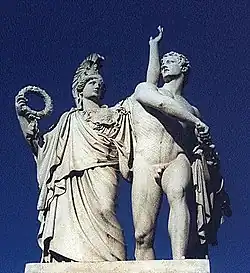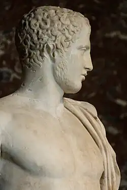 Virgil's Aeneid describes the beauty and prosperity of Diomedes' kingdom. When war broke out between Aeneas and Turnus, Turnus tried to persuade Diomedes to aid them in the war against the Trojans. Diomedes told them he had fought enough Trojans in his lifetime and urged Turnus that it was best to make peace with Aeneas than to fight the Trojans. He also said that his purpose in Italy is to live in peace.[41] Venulus, one of Latinus' messengers, recalls the mission to Diomedes after they seek his help in the war against the Rutulians. He states that when he found Diomedes, he was laying the foundations of his new city, Argyrippa.[42] Diomedes eventually speaks and states that, as punishment for his involvement at Troy, he never reached his fatherland of Argos and that he never saw his beloved wife again. The hero also states that birds pursue him and his soldiers, birds which used to be his companions and cry out everywhere they land, including the sea cliffs.[42] Ovid, on the other hand, writes that Venulus came to the home of exiled Diomedes in vain, but he was erecting walls with the favour of Iapygian Daunus, his new father-in-law, which would make the city Luceria, not Argyrippa.[43]