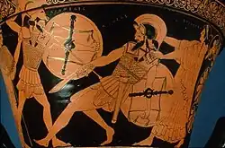 When the sacrifice of Iphigenia (Agamemnon's daughter) became a necessity for the Achaeans to sail away from Aulis, King Agamemnon had to choose between sacrificing his daughter and resigning from his post of high commander among Achaeans. When he decided to sacrifice his daughter to Artemis, Odysseus carried out this order of Agamemnon by luring Iphigenia from Mycenae to Aulis, where murder, disguised as wedding, awaited her.[9] According to Hyginus, Diomedes went with Odysseus to fetch Iphigenia, making this the two companions' first mission together.[10] However, Pseudo-Apollodorus has Agamemnon send Odysseus and Talthybius instead.[11] According to Euripides, neither of the two went to fetch Iphigenia, though he calls the plan Odysseus' idea in Iphigenia at Tauris.[12]