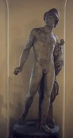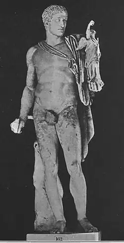 The worship and service of gods and heroes was spread by Diomedes far and wide: in and near Argos he caused temples of Athena to be built.[44] His armour was preserved in a temple of Athena at Luceria in Apulia, and a gold chain of his was shown in a temple of Artemis in Peucetia. At Troezene he had founded a temple of Apollo Epibaterius and instituted the Pythian games there.[45] Other sources claim that Diomedes had one more meeting with his old enemy Aeneas where he gave the Palladium back to the Trojans.