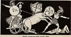Pandarus throws his spear mistakenly thinking he mortally wounds Diomedes. Diomedes returns the blow by throwing his spear at a bragging Pandarus, killing him instantly. Aeneas is left to fight against a now unarmed Diomedes, who picks up a huge stone and crushes Aeneas' hip with it. Fainting, Aeneas' mother protects him with her garment as Diomedes' comrade Sthenelus springs Aeneas' horses free from the Trojans and taken by Deipylus to their ships. Aphrodite drops her son, Aeneas, while under attack by Diomedes, who is following Athena's orders. Apollo comes to the rescue of Aeneas and sends the wounded Aphrodite fleeing back to Olympus. Disregarding Athena's advice, Diomedes attacks Apollo three times before he warns him not to match himself against immortals. Diomedes then withdraws from combat having failed to kill Aeneas, but succeeding in obtaining what he considers to be the finest steeds alive (and later in Book XXIII, winner of the chariot race for Patroclus, despite starting in last place).
