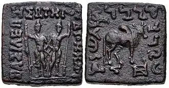 Silver coin of Diomedes. Obverse shows the King wearing a Boeotian helmet and royal diadem, with Greek legend: ΒΑΣΙΛΕΩΣ ΣΩΤΗΡΟΣ ΔΙΟΜΗΔΟΥ, Basileōs Sōtēros Diomēdou, "Of King Diomedes the Saviour". Reverse with standing Dioscuri, and the Kharoshti legend: Maharajasa Tratarasa Diyametasa, "Of the Great Saviour King Diomedes".