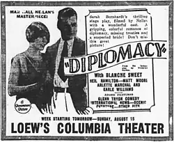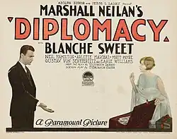 Diplomacy is a 1926 American silent mystery film produced by Famous Players–Lasky and distributed through Paramount Pictures. The movie is an update of the play Dora by Victorien Sardou. Marshall Neilan directs his then wife Blanche Sweet who stars.