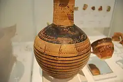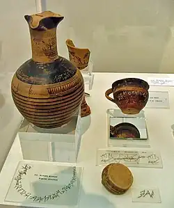 Dipylon oenochoe (left), on display in the National Archaeological Museum, Athens. The inscription is scratched into the dark band around the shoulder of the vase. | |