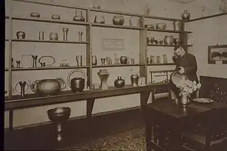 In September 1909 van Erp entered into a partnership with Elizabeth Eleanor D'Arcy Gaw (1868–1944),[5] who had attended the Art Institute of Chicago. She had also studied English Arts and Crafts in London at the Guild and School of Handicraft, founded by Charles Robert Ashbee.[3] They opened a studio at 376 Sutter Street, San Francisco in mid-September.[3] From February 1910 the partnership began marking their wares with a stamped device of a windmill, with their names underneath. The partnership ceased on 30 January 1911; van Erp continued marking with the windmill device, with D'Arcy Gaw's name cut out from the stamp.[3] The cutting-out of her name was not complete, and some wares can be found with a faint impress of some or all of the letters.[6]