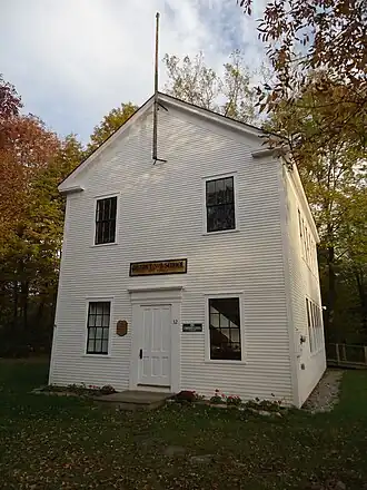 The school was built in 1861, as a single-story structure, and was the third school building to stand on the site. Of the town's fifteen district schools, it is now the only surviving one still in public hands. The building's second story was added in 1915, and it served as a school until a fire in its wood stove caused significant interior damage. The building was thereafter used by the town for storage and as a garage, adding a garage door to the front. In 1983, the building was taken over by the local historical society, which undertook a partial restoration of the building to its early 20th-century appearance. Because the restoration was not completed, the building again deteriorated, and a renewed drive was undertaken to make it fully usable as a community space.[2] The restoration was finished in 2019 thanks to local funding through Friends of the Old Schoolhouse.