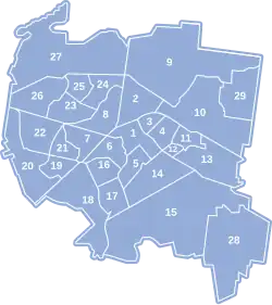 The city of Białystok is divided into 29 administrative units known in Polish as osiedle (housing estate, or residential neighborhood; plural: osiedla). The first 27 of these were created by City Council bylaw no. XXXI/331/04 of October 25, 2004. The 28th, Dojlidy Górne, was created by City Council bylaw no. LXII/787/06 of October 23, 2006, out of three settlements which had been incorporated into the city: Dojlidy Górne, Kolonia Halickie, and Zagórki. A new district called Bagnówka was created at the beginning of 2021.[1]