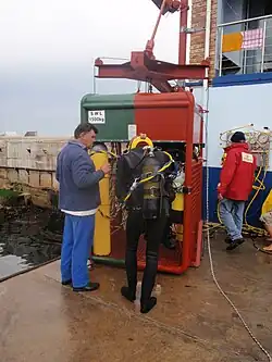 A diving bell is a rigid chamber used to transport divers from the surface to depth and back in open water, usually for the purpose of performing underwater work. The most common types are the open-bottomed wet bell and the closed bell, which can maintain an internal pressure greater than the external ambient.[1] Diving bells are usually suspended by a cable, and lifted and lowered by a winch from a surface support platform. Unlike a submersible, the diving bell is not designed to move under the control of its occupants, or to operate independently of its launch and recovery system.