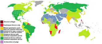 Divorce law, the legal provisions for the dissolution of marriage, varies widely across the globe, reflecting diverse legal systems and cultural norms. Most nations allow for residents to divorce under some conditions except the Philippines (although Muslims in the Philippines do have the right to divorce) and the Vatican City, an ecclesiastical sovereign city-state, which has no procedure for divorce.[1][2] In these two countries, laws only allow annulment of marriages.[3]
