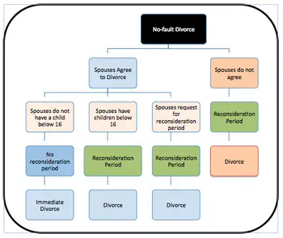 In other jurisdictions such as United Kingdom[29] and Singapore,[30] divorce is granted on the basis of an irretrievable breakdown of marriage. Under current divorce law in England and Wales, a person has to prove in court that the marriage has broken down; there are five reasons for which a marriage can be considered to have broken down: adultery, unreasonable behaviour, desertion after two years, two years' separation with consent or five years' separation without consent.[31]