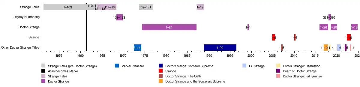 Publication date | (vol. 1) June 1968 – November 1969 (vol. 2) June 1974 – February 1987 (Sorcerer Supreme) November 1988 – June 1996 (vol. 3) February 1999 – May 1999 (vol. 4) December 2015 – April 2017 (vol. 1 cont.) January 2018 – July 2018 (vol. 5) August 2018 – December 2019 (Dr. Strange) February 2020 – October 2020 (vol. 6) May 2023 – October 2024 |