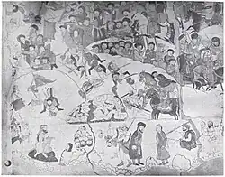 As for Jammu State, the first paintings seem to date to the reign of Raja Hari Dev (r. 1660–90).[9] As Jammu became a powerful and hegemonic entity within the region above the rest, this brought upon peace, prosperity, and stability, which attracted painters to the Jammuite court, leading to the developing of Jammu State as a painting centre in the hills region.[9] Raja Dhruv Dev's four sons were all patrons of painting, especially Raja Balwant Singh of Jasrota State.[9] When Mughal officials sought refuge in Jammu State, they possibly brought Mughal miniature paintings with them and had an impact on the local fashion of Jammu, which is revealed in the miniature paintings produced after their arrival.[9] The extant wall-paintings of the territories of J&K State all date back to the reign of Gulab Singh, however there are miniature paintings that pre-date this time.[9] The brothers of Gulab Singh, Dhian Singh and Suchet Singh, were patrons of wall-paintings.[9] Gubab Singh's son and successor, Ranbir Singh, kept an atelier of artists.[9] The Dogra nobles were rich in wealth, this allowed them to pay for the patronization of artists.[9] Petty Rajputs and aristorcrats also emulated the royal-class by patronizing artists.[9] The patrons of temple construction, usually the mercantile-classes belonging to the Vaishya varna that were engaged in trade and industry, had the temple walls decorated with murals.[9]