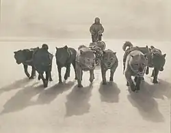 Douglas Mawson, the leader and organizer of the Australasian Antarctic Expedition, decided to take fifty Greenland dogs with him; he believed that number would be more than sufficient for the exploratory sledge journeys that he was planning to undertake during the year he planned to spend in Antarctica.[1] Mawson favoured dogs over ponies because, although they could only pull a little more than their own body weight, their food could be supplemented with meat from the fauna of Antarctica and – if necessary – from other dogs, so they did not need the vast imports of fodder that ponies required to see them through an expedition.[2] Mawson had been impressed by the enthusiasm of the dogs on the Nimrod Expedition when he had accompanied Ernest Shackleton to Antarctica.[2] Both Shackleton and Robert Falcon Scott were dubious of the advantage of dogs over ponies. Amundsen and the Arctic pioneer Fridtjof Nansen were passionate advocates and thought the British explorers had misunderstood how to employ dogs in the polar regions; Amundsen pointed to their successes in the Northern Hemisphere and the relative ease of handling dogs compared with ponies, especially in heavily crevassed areas where a fallen dog could often be easily retrieved but a fallen pony was usually lost.[3] The Norwegians were thoroughly utilitarian in their approach to dogs though; although they could be affectionate with the animals, there was little thought given to their survival when they had outlived their usefulness. Scott had used dogs on his Discovery Expedition and had felt it badly when he had been forced to kill them all during his southern sledging journey.[4] Nevertheless, his attitude towards dogs was similar to Amundsen's and Mawson's:
