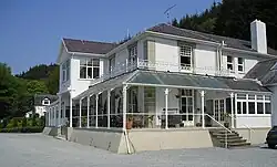The industrial line crossed the river by a substantial girder bridge. The bridge, long used as a footbridge, and the only way to reach the station from the village of Dolgarrog, is now slated for closure.[1] It was initially equipped with two locomotives, ten 12 ton wagons, and two passenger carriages. Morning and evening passenger services were free and operated from 1917 to 1932. Goods traffic, which was heavy during the war, continued but declined in the 1950s. The line closed in 1960 and was lifted in 1964.