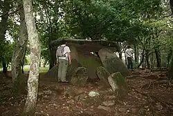 Dolmen de Axeitos is a prehistoric megalithic dolmen just to the northwest of the village Axeitos, in the parish of Oleiros, in the municipality of Ribeira, on the Barbanza Peninsula in the estuary of the Ría de Arousa in the Province of A Coruña, Galicia, in northwestern Spain. It is dated to 3600-4000 BC. Because of its historical and archaeological value, on March 11, 1978 it became a registered Bien de Interés Cultural landmark.