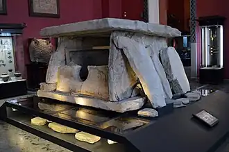 Concentrations of megaliths, dolmens (Adyghe: исп-унэ) and stone labyrinths dating between the end of the 4th millennium and the beginning of the 2nd millennium B.C. have been found (but little studied) throughout the Caucasus Mountains, including Abkhazia, Georgia. Most of them are represented by rectangular structures made of stone slabs or cut in rocks with holes in their facade. These dolmens cover the Western Caucasus on both sides of the mountain ridge, in an area of approximately 12,000 square kilometres of Russia and Abkhazia.