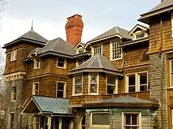 Furness altered an existing stone house, turning its first and second floors into the hall and upper hall of the new house, and shooting out rooms in multiple directions.[3] This was one of his most exuberant and freewheeling suburban houses, featuring a stone water tower with Juliet balconies, his trademark "upside-down" brick chimneys, roofs with jerkin head gables, dormers topped with gabled, hipped, shed (and even one tall, pyramidical) roofs, a great bay window thrusting out at the top of the stairs, and a Japanese tea room appended to the wrap-around porch. Architectural historian James F. O'Gorman described the exterior as "a plastic chorus of towers, bays, sheds, gables, and chimneys."[4] The upper floors were clad in wood shingles, varying between shakes and fish-scales.