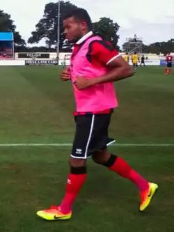 He signed his first professional contract in February 2014,[8] and spent most of the following season on loan at Conference North side Tamworth.[9] He made his senior debut on 4 October, playing in a 2–2 draw away to Guiseley in which he was given a yellow card in the 74th minute.[10] He made 23 league appearances for the Lambs and two more in the FA Cup, scoring the equaliser in a 2–2 home draw against North Ferriby United on 8 November.[11] His loan was extended on 31 December,[12] and he was recalled by Shrewsbury on 9 April 2015.[13]