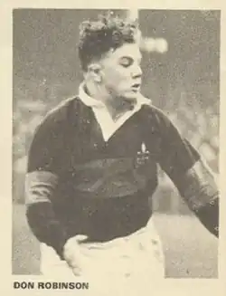 Donald Robinson (4 June 1932[5] – 27 May 2017[6]) was an English World Cup winning professional rugby league footballer who played in the 1940s, 1950s and 1960s, and coached in the 1960s and 1970s. He played at representative level for Great Britain, England, Yorkshire and Rugby League XIII, and at club level for St Joseph's School, Airedale Youth Club, Fryston Colliery, Kippax Juniors, Newmarket Colliery, Wakefield Trinity (captain), Leeds and Doncaster,[7] as a centre, prop, second-row or loose forward,[1] and coached at Doncaster and Bramley (late-1970s).