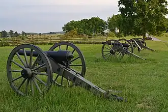 At the Battle of Antietam on 17 September 1862, the Donaldsonville Artillery was equipped with three 6-pounders, two 10-pounder Parrott rifles, and one 3-inch Ordnance rifle. The battery reported no casualties during the action.[1][10] Maurin's battery was part of Major John Selden Saunders' artillery battalion, part of Anderson's division. The unit unlimbered near Piper's barn along with Captain Cary F. Grimes' Virginia battery.[11] After bitter fighting, Union forces drove the Confederate infantry from Bloody Lane. After 1:00 pm, a further Union advance was blocked by Saunders' four batteries, including Maurin's.[12] After 2:00 pm, while firing from Cemetery Hill, the battery helped block a Federal thrust from Middle Bridge.[13] At the Battle of Shepherdstown on 19 September, Maurin's battery took losses of 1 killed and 2 wounded.[14] The battery also lost one 10-pounder Parrott rifle, which had originally been captured from 5th U.S. Artillery, Battery D at the First Battle of Bull Run.[15] While retreating cross-country from Union pursuit at night, the crew encountered an impassable woods; they abandoned and spiked the gun. At Shepherdstown, one caisson with 6-pounder ammunition was blown up by a Union shell and 20 horses were killed.[16]